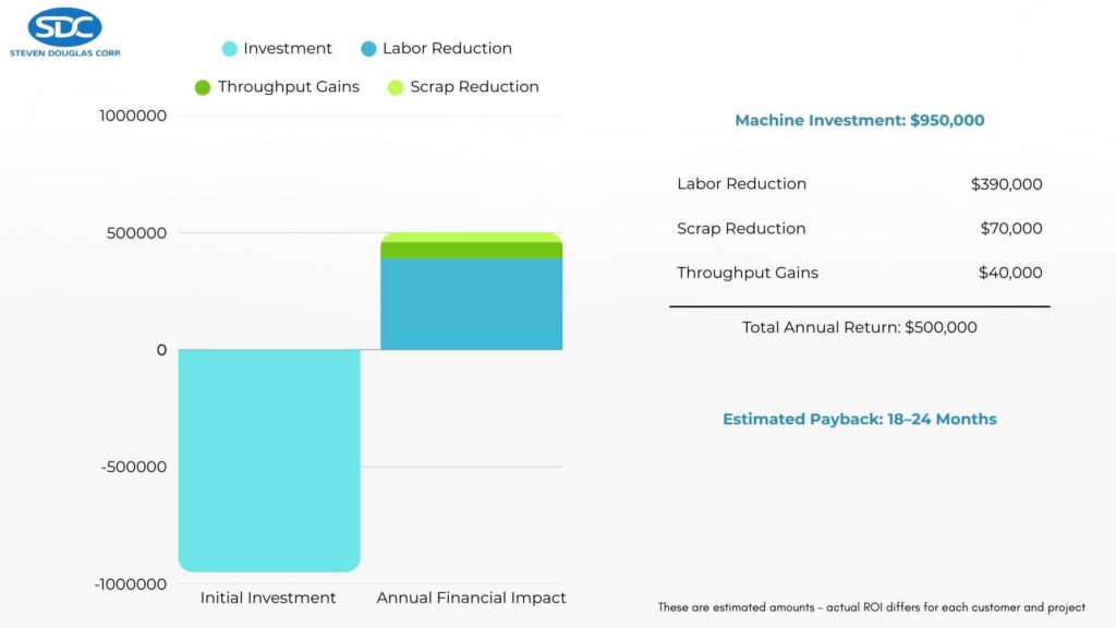 A $950,000 custom automation machine replaces four operators per shift across two shifts, reducing annual labor costs by approximately $390,000. With additional savings from scrap reduction and improved throughput, the total annual financial impact can reach $450,000–$500,000. At that rate, the system achieves payback in roughly 18–24 months. In higher-volume or three-shift operations, payback is often even faster. After full payback, the machine continues generating cost savings and capacity gains for years.